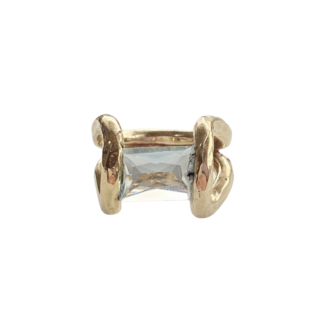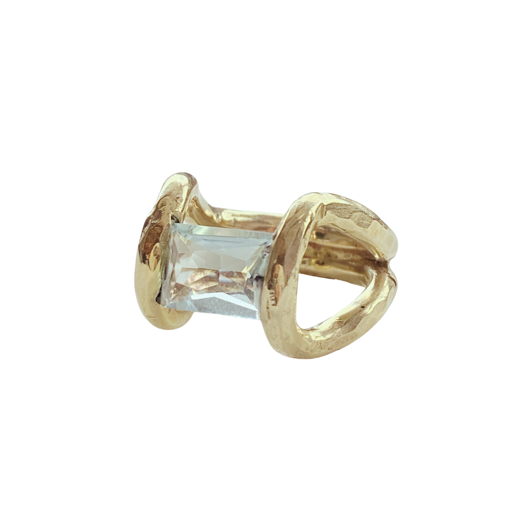 Diseño Hecho a Mano en Latón Martelé con Piedra Rectangular Aguamarina Facetada a Mano. Hecho en México.