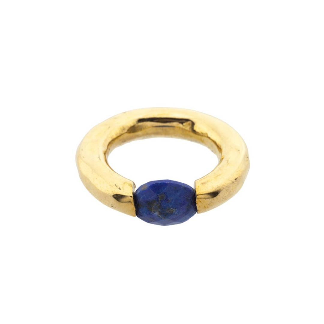 Aro hecho en latón con terminación martelé a mano por orfebres mexicanos. Las piedras son facetadas a mano artesanalmente.