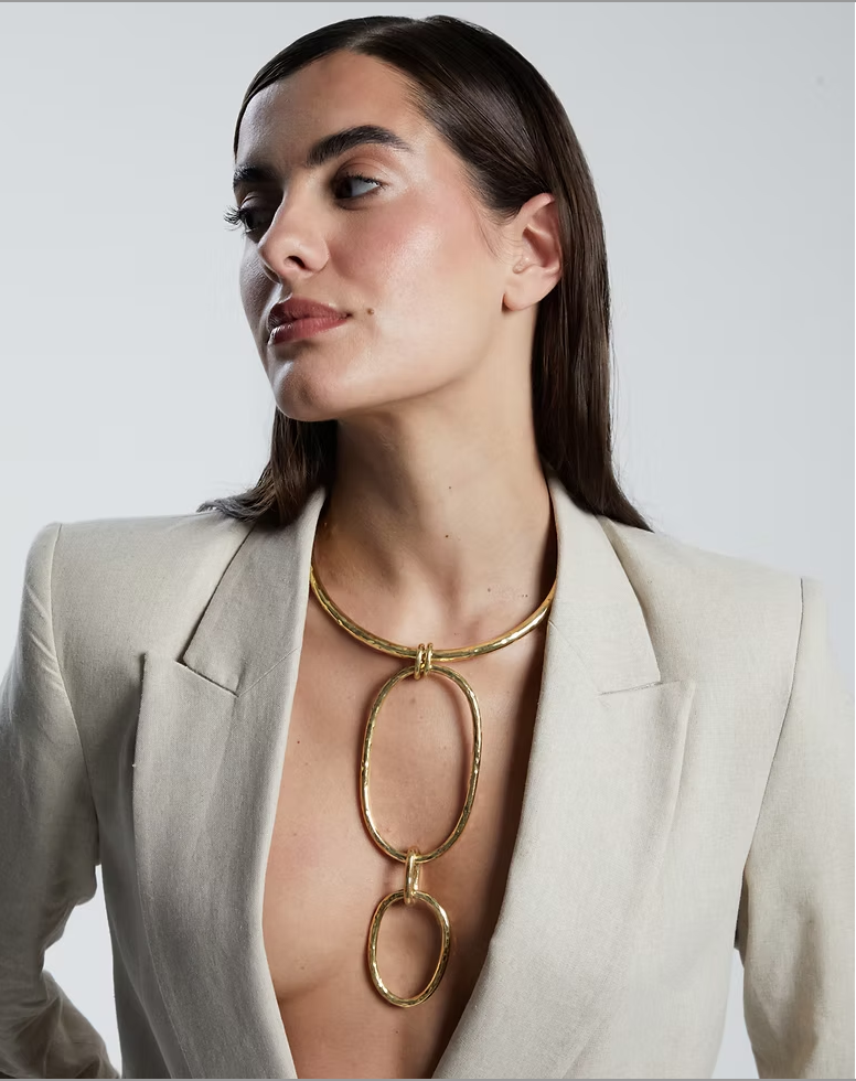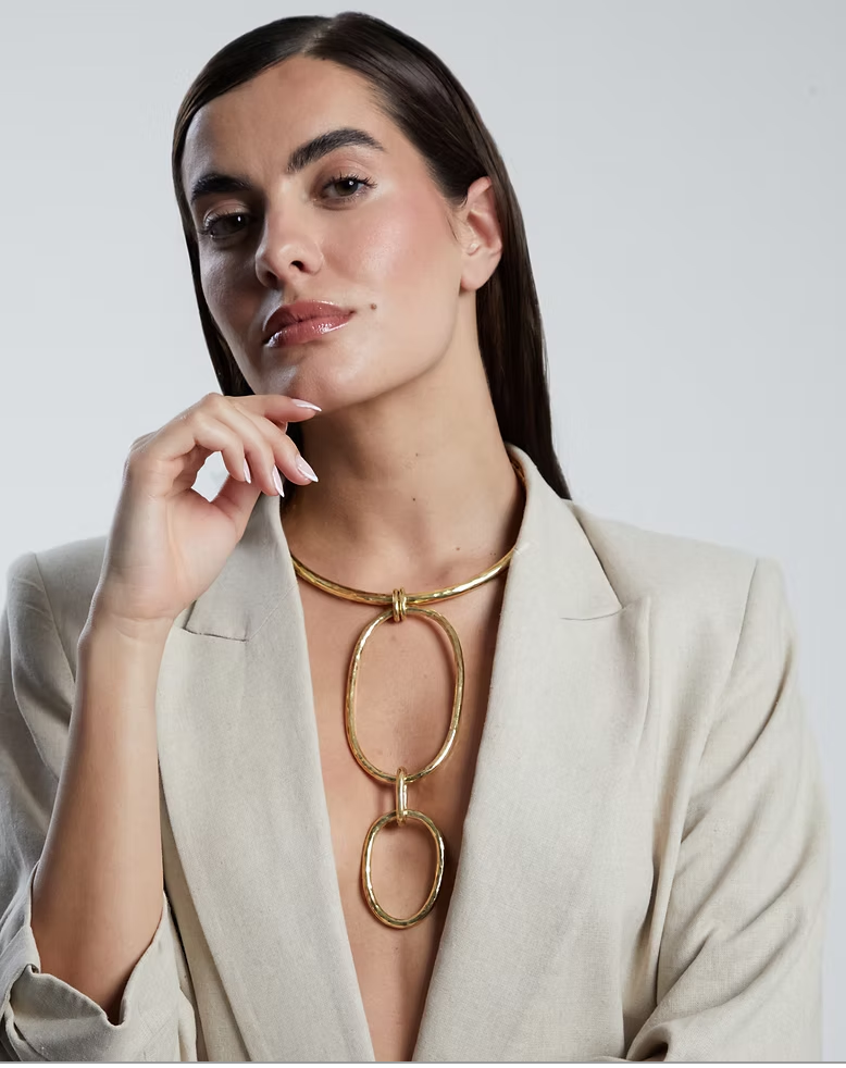 Choker Rígido con Dije Doble Óvalo. Hecho a Mano por Artesanos Mexicanos en Latón Martelé. El dije se puede utilizar de dos formas.